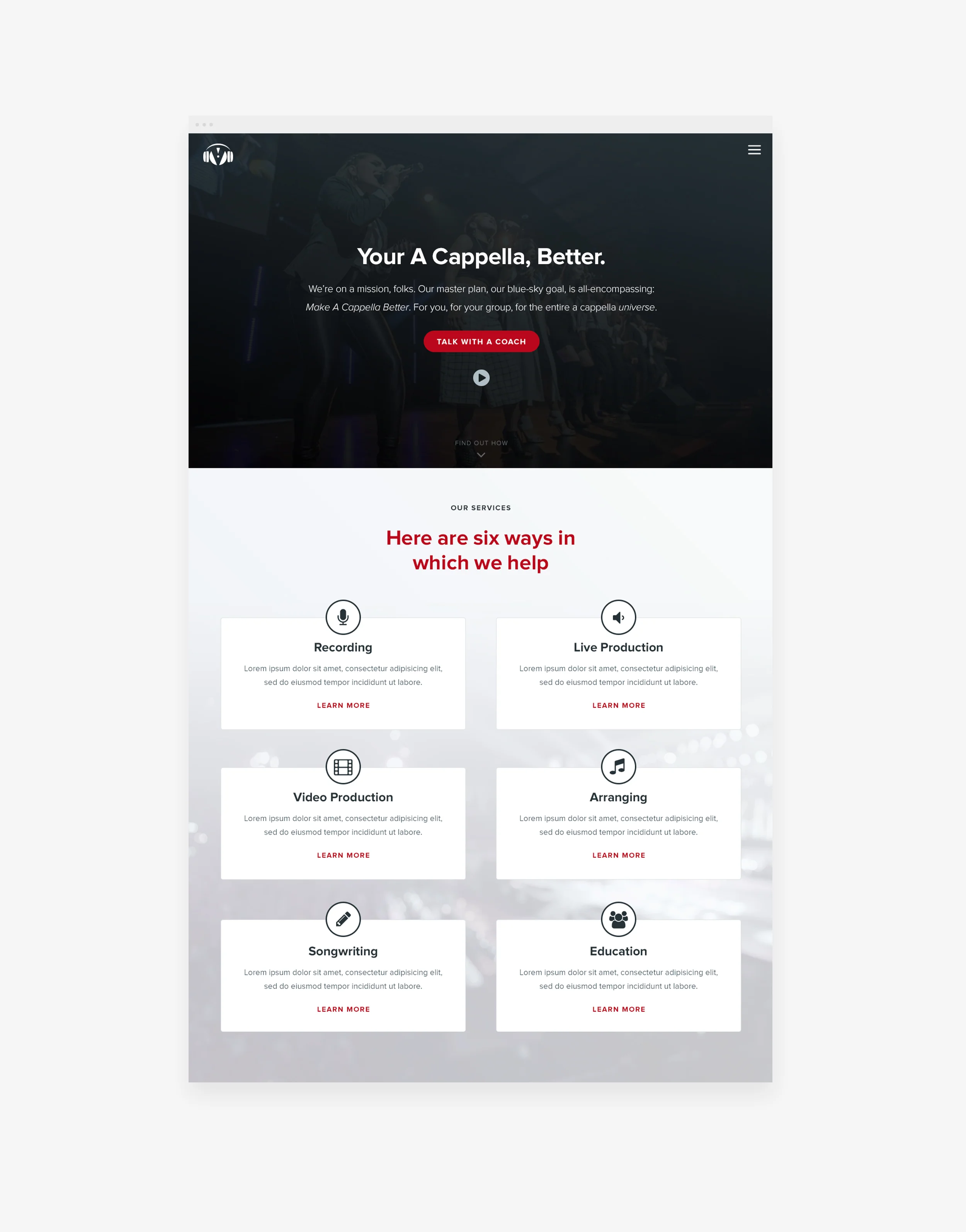 As trailblazers in the world of contemporary a cappella, The Vocal Company (TVC) has been on a long-standing mission to improve vocal music production and education. Over the past decade the company has built a unique community—attracting the best producers, engineers, arrangers, and performers in the industry. In 2016, TVC was looking to invest in its digital marketing infrastructure to help fuel continued growth. The effort would require a new digital strategy and a full redesign of TVC’s brand, assets, and service offerings.